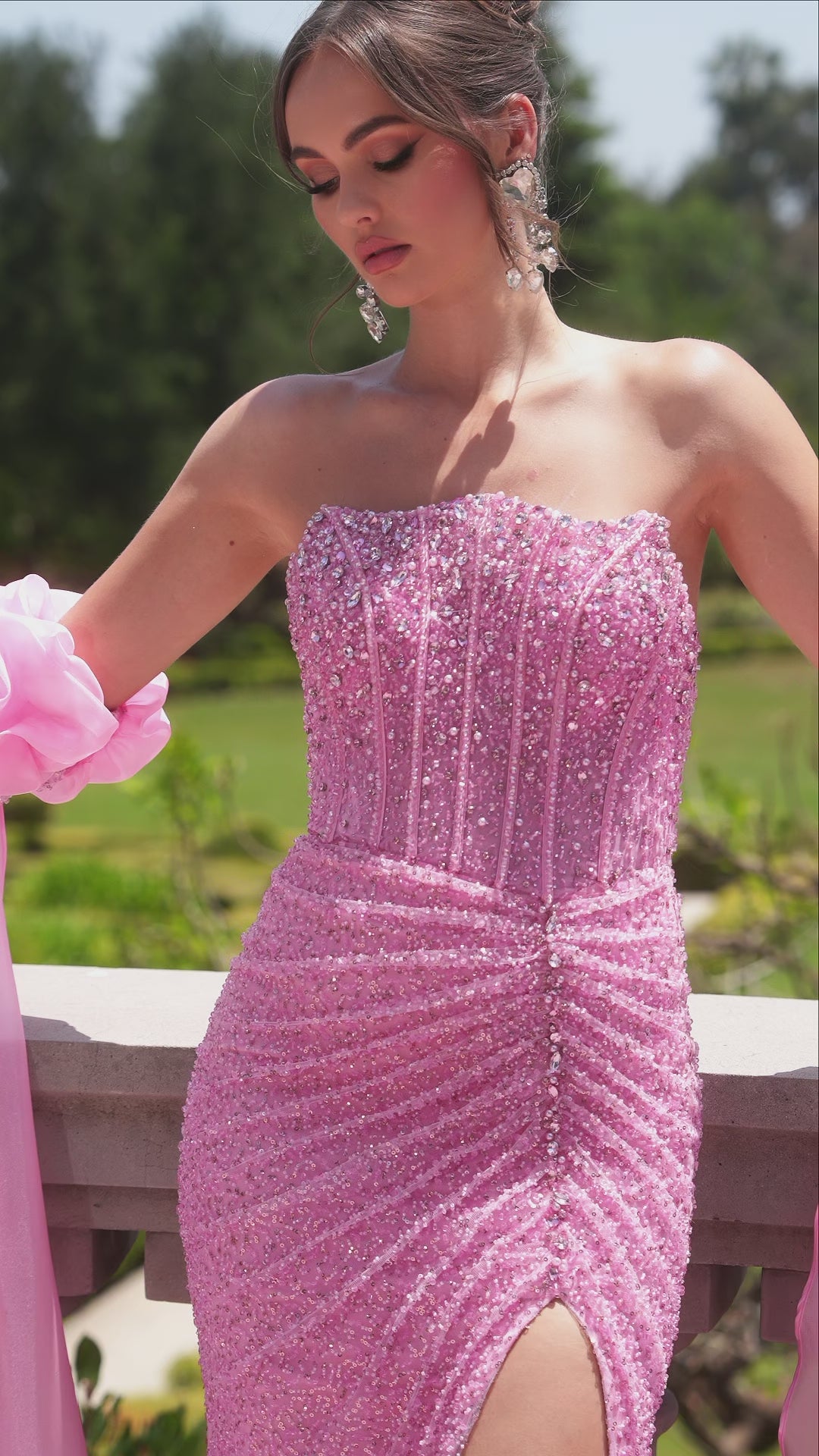 A strapless beaded gown with structured boning, hip ruching, and a thigh-high slit. This dress comes with the gloves shown and has medium stretch.