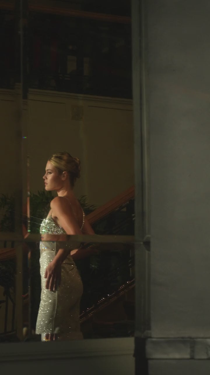 • Design: Modern neckline, sheer embellished bodice & leg slit
